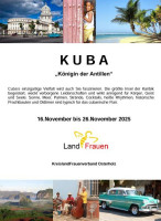 Es ist wieder soweit: Landfrauen gehen auf Reisen. Erleben Sie Vom 16.11. bis zum 26.11.2025 eine unvergessliche Reise nach Kuba, die "Königin der Antillen"! Nach einem Bustransfer zum Flughafen Hamburg und einem Flug nach Havanna, werden Sie am späten Nachmittag von Ihrer Reiseleitung empfangen und ins Hotel Mystic Havana* begleitet. Nach einem köstlichen Abendessen verbringen Sie die erste Nacht in der pulsierenden Hauptstadt.