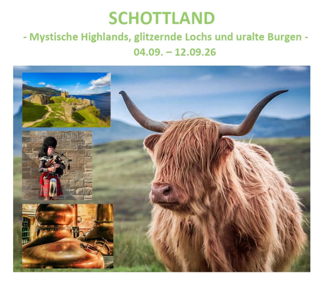 Vom 04.09.–12.09.2026 führt uns diese abwechslungsreiche Rundreise durch einige der schönsten und geschichtsträchtigsten Regionen Schottlands.