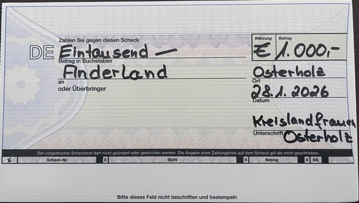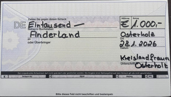 Die offizielle Spendenübergabe fand am 28. Januar 2026 statt. Unsere Kreisvorsitzende Martina Rodenburg-Schade überreichte den symbolischen Scheck an Gerd Rühlemann von Anderland. Er bedankte sich herzlich für unsere Unterstützung und lud uns ein, uns vor Ort selbst ein Bild von der wertvollen Arbeit des Vereins zu machen.