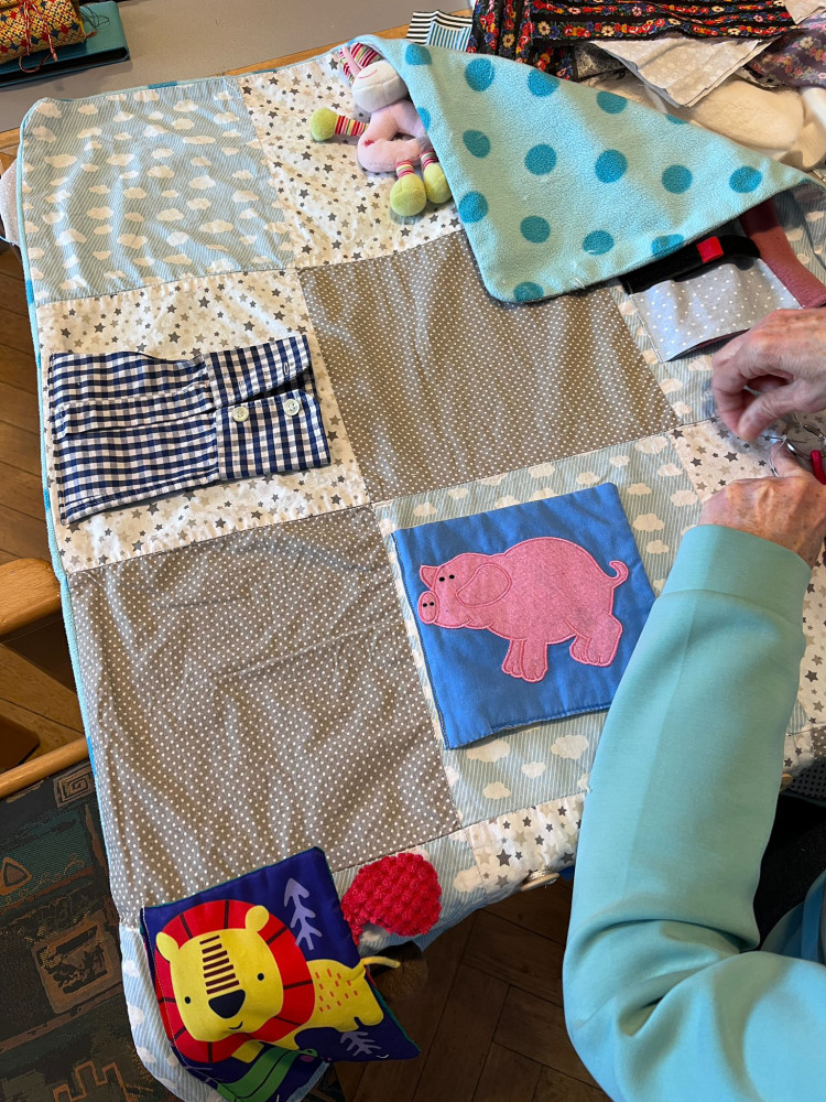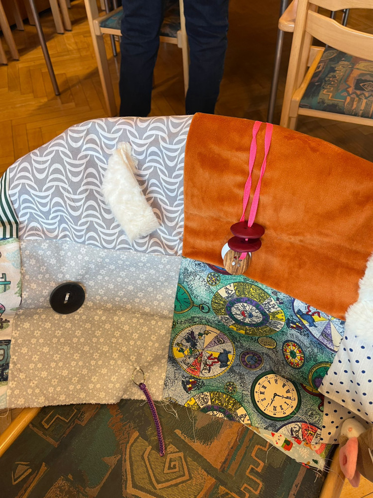 Diese Decken sind speziell für Menschen mit Demenz gestaltet. Unterschiedliche Stoffe, Knöpfe, Reißverschlüsse oder Bänder laden zum Tasten und Fühlen ein. Sie fördern die Beschäftigung der Hände, können beruhigend wirken und geben Sicherheit im Alltag.