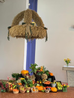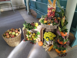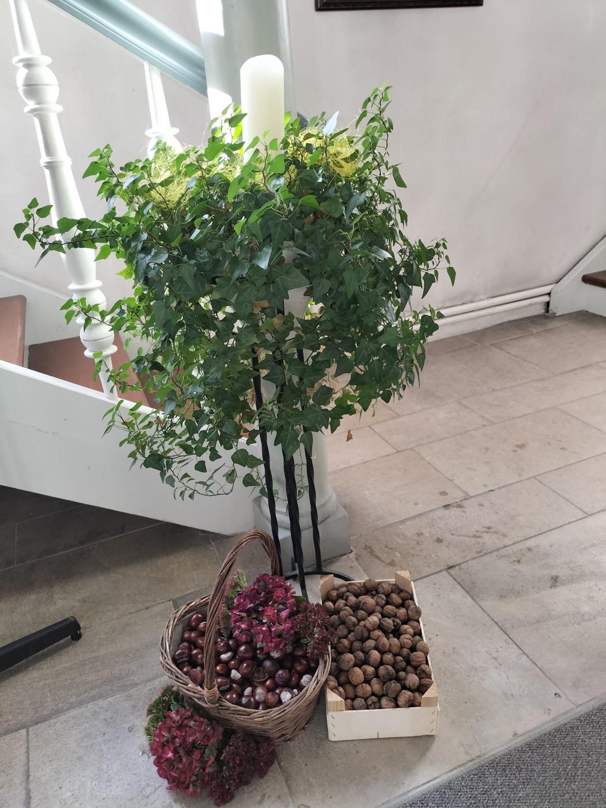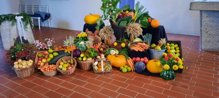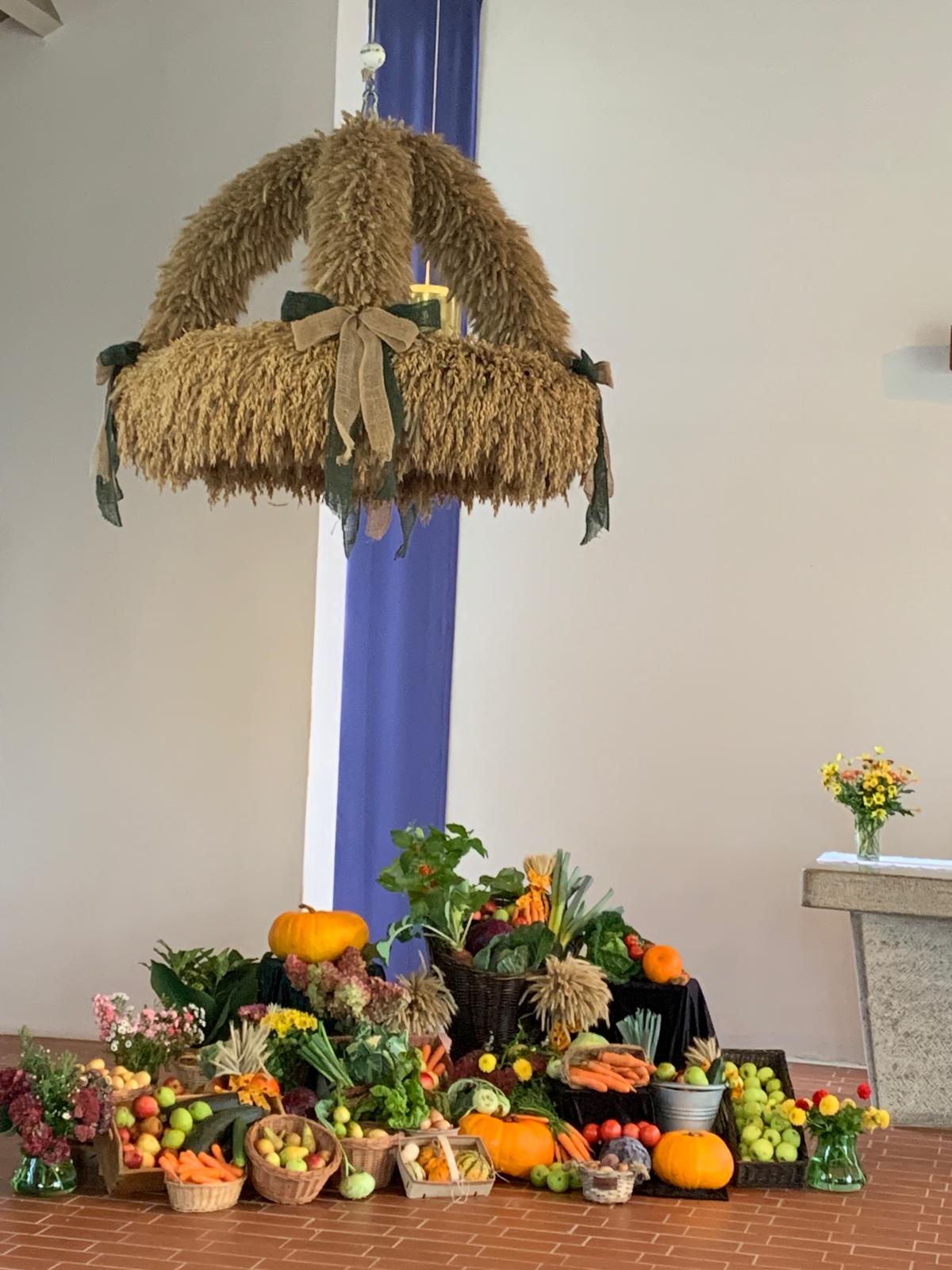 Auch in diesem Jahr waren wieder fleißige Bienen am Werk und haben den Altarraum mit Erntegaben für den Gottesdienst geschmückt.