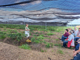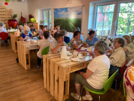 Nach dem wir dann noch im tollen Hofladen eingekauft haben ging die Fahrt weiter zur Ginsengfarm. Der Ginsenganbau mit der Vermarktung ist einzigartig in Deutschland wenn nicht in Europa. Mit dem Bus ging es durch Wald und Feld bis zum 1,5ha großem Ginsengfeld. Die Felder haben alle ein Sonnendach, da Ginseng keine Sonne verträgt. Nach 6 Jahren haben die Wurzeln die höchste Anzahl von Ginsenosiden erreicht und werden dann geerntet und verarbeitet. Nach Stärkung mit Kaffee und Kuchen besuchten wir noch die gläserne Schokoladenmanufaktur und durften Schokolade naschen und probieren. Wir erfuhren viel über Kakao-Anbau und der Herstellung von Schokolade. Hier wurde dann auch nochmal ein bisschen eingekauft, bevor Rolf - unser Busfahrer - uns wieder sicher nach Hause brachte.