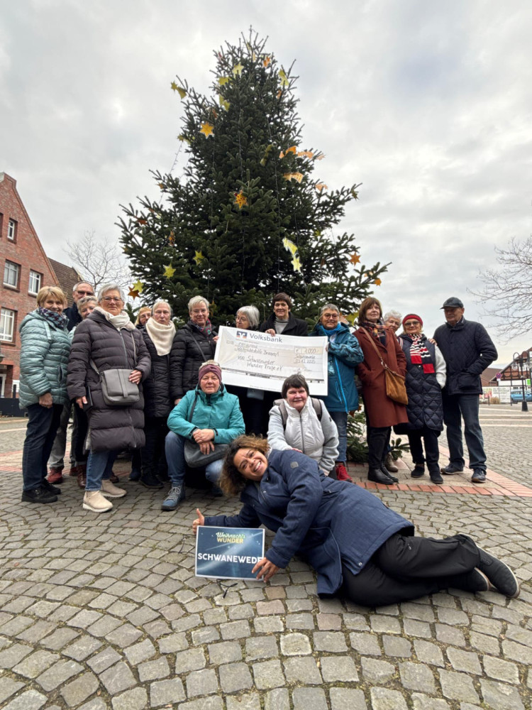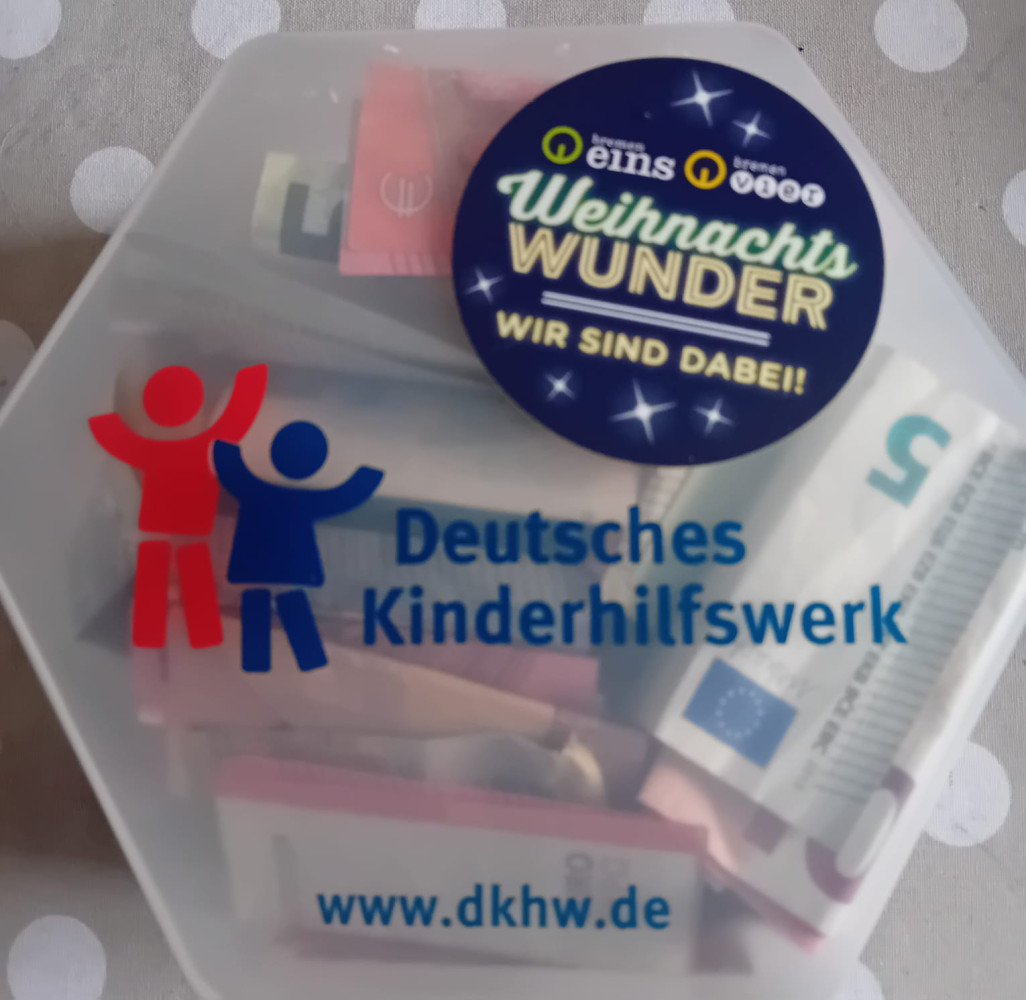 Am 03.12.2025 konnten wir eine prall gefüllte Spendendose mit 385,- Euro an Janine Horsch von Radio Bremen eins übergeben, die im Rahmen ihrer Spendentour von Bremerhaven nach Bremen bei uns auf dem Schwaneweder Marktplatz halt gemacht hatte. Die Spendenaktion kommt dem Deutschen KInderhilfswerk zugute.