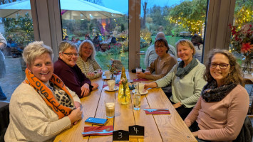 Gemütliches Kaffeetrinken der Landfrauen, am 04.08.21, im Cafe/Restaurant "Teatime" am Golfplatz. Ehrungen der Mitglieder mit 25, 40, und 50. jähriger Mitgliedschaft. Dörte Stellmacher vom NLV überreichte die Ehrenurkunden und die Biene mit grünem Stein für langjährige Tätigkeit im Vorstand der Landfrauen.